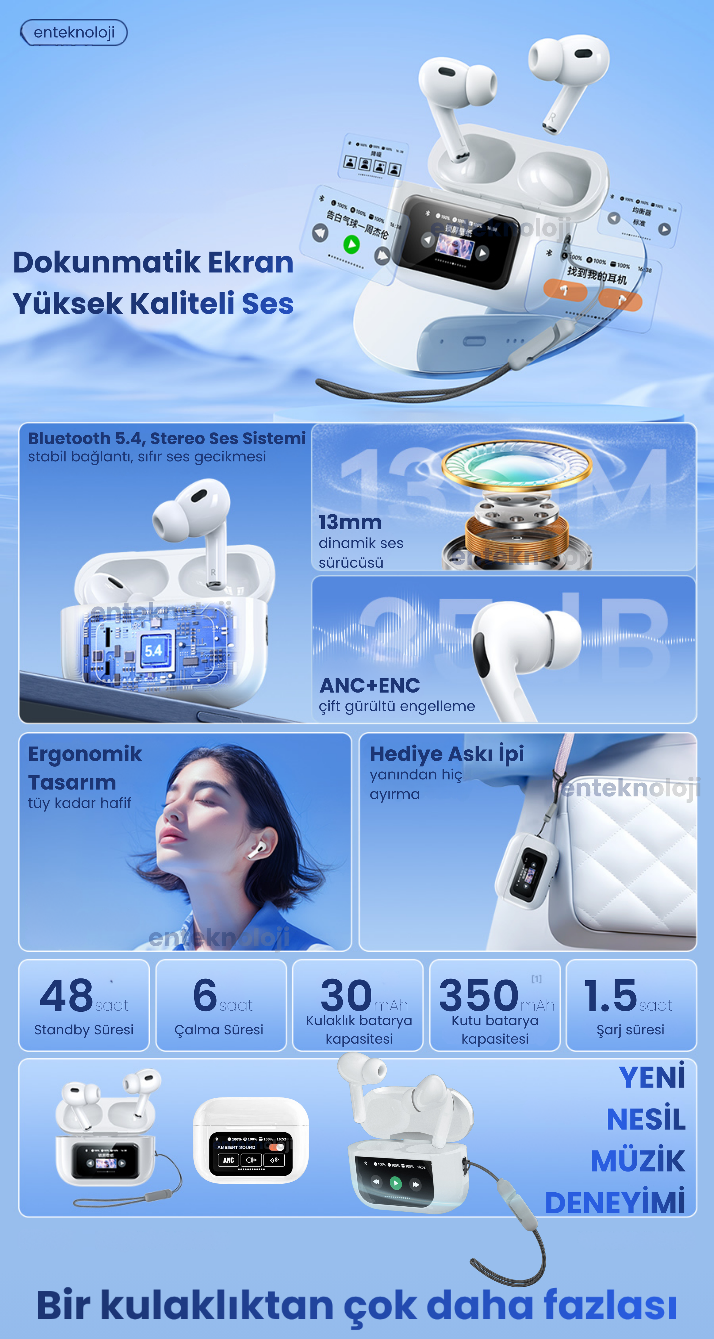 Ergonomik Tasarım(Her Kulağa Uygun): Dokunmatik Ekranlı Air Pro 2 ANC Bluetooth Kulaklık, kulak yapınıza tam oturacak şekilde tasarlanmış ileri seviye yeni nesil kablosuz kulaklık modelir.