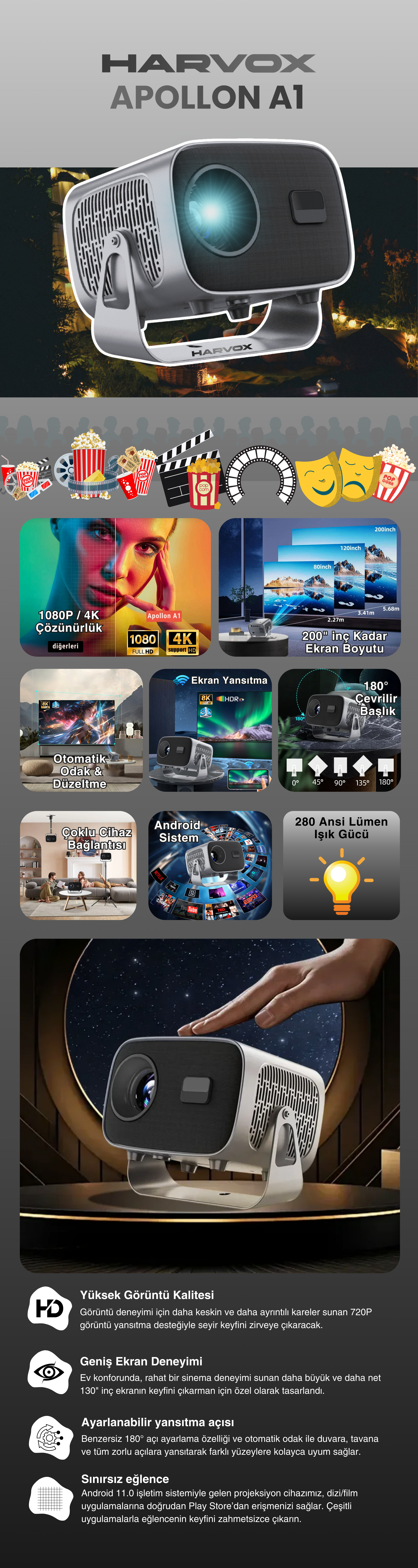 Harvox Apollon A1, net ve keskin bir görüntü sağlayan 1280x720p doğal çözünürlüğe sahiptir. Ekran boyutuna gelince,200 inçe kadar etkileyici bir görüntü yansıtabilir ve alanınızı gerçek bir sinema salonuna dönüştürebilir.