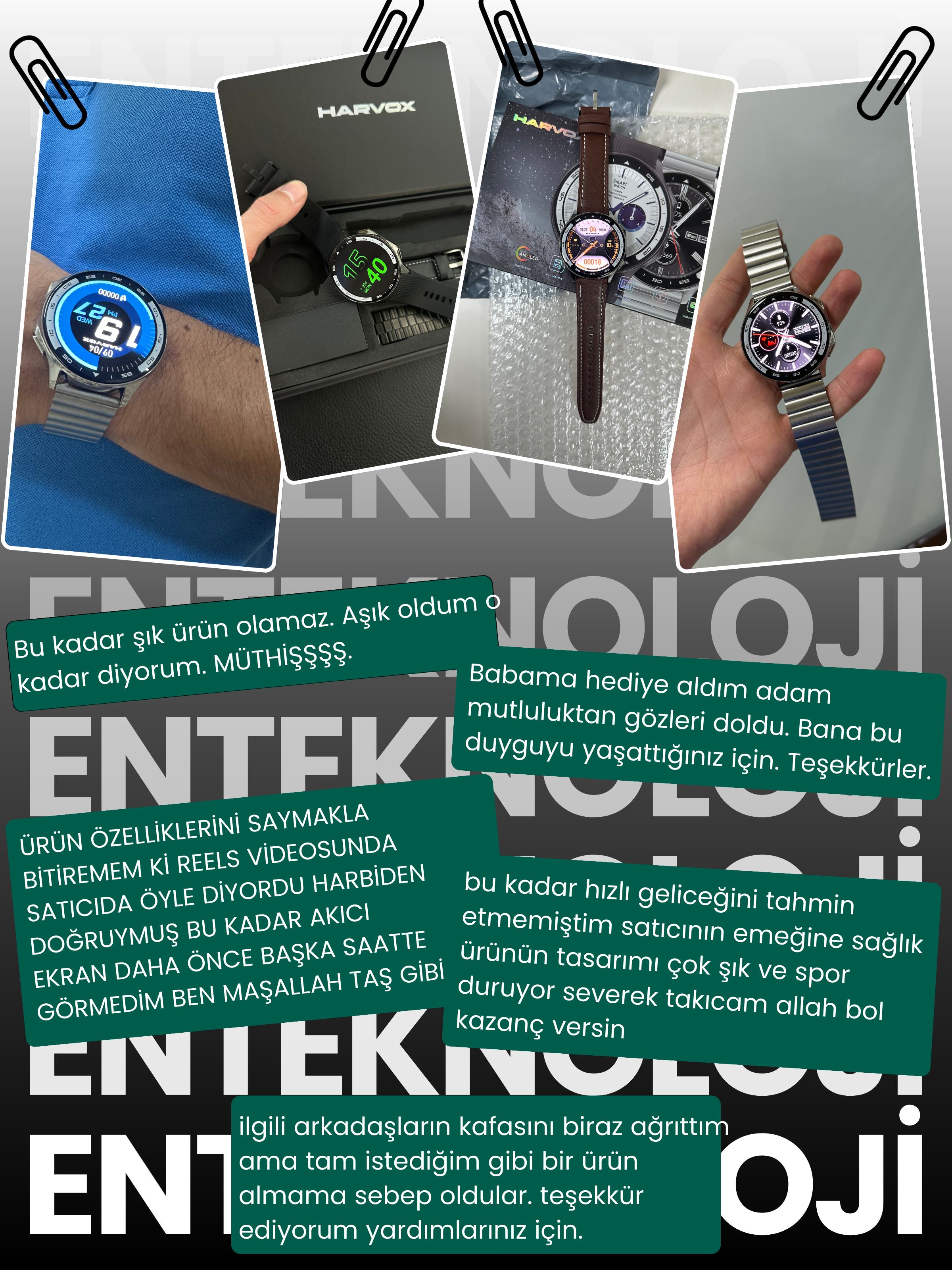 Paşama söz vermiştim sizden saat alıcam diye en yeni modelinizi bekledim ve geldi direkt aldım aşık oldu oğlum resmen saate ve kadranları her kombinine uyumlu oluyor. Teşekkürler enteknoloji.