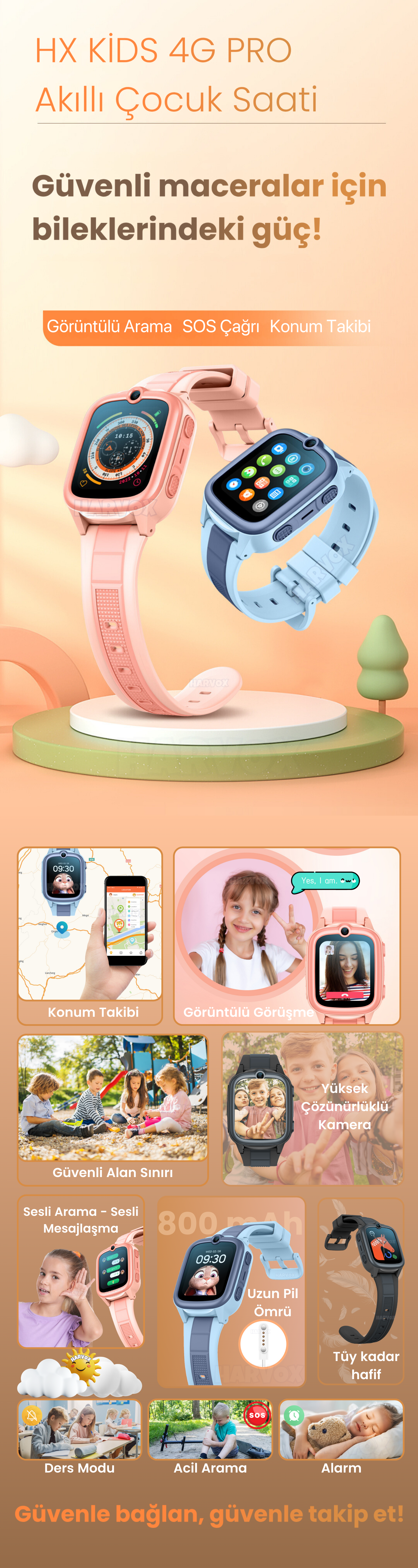 Görüntülü arama, sesli arama, konum takibi, sesli mesajlaşma, güvenli alan, dinamik çit, yürüyüş adım takibi, kamera gibi özellikleri ile çocuğunuz güvende olurken siz de huzurlu oluyorsunuz.