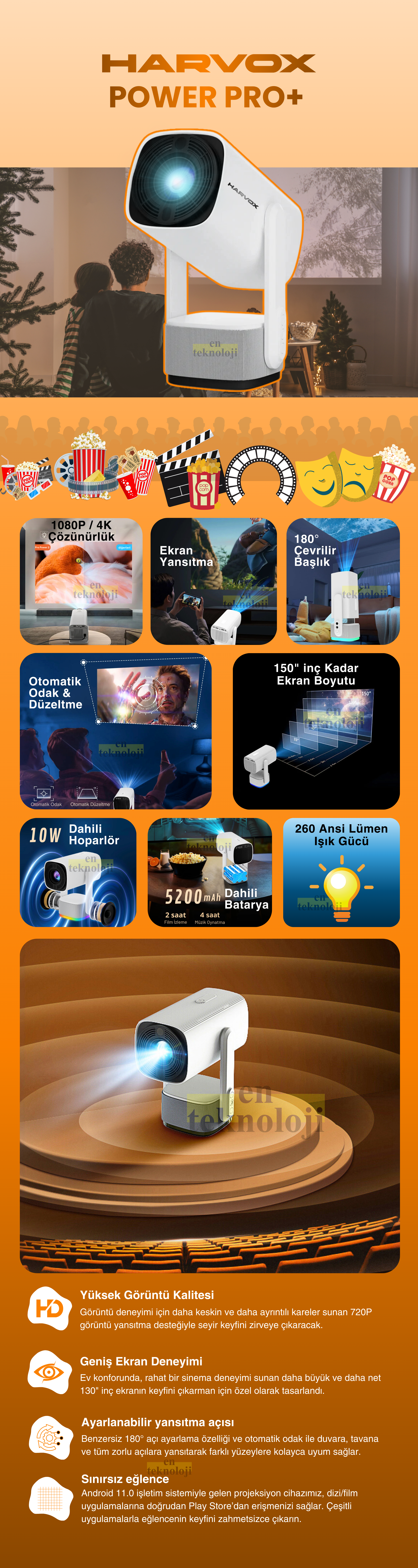 Harvox Power Pro+, net ve keskin bir görüntü sağlayan 1920x1080p doğal çözünürlüğe sahiptir. Ekran boyutuna gelince,150 inçe kadar etkileyici bir görüntü yansıtabilir ve alanınızı gerçek bir sinema salonuna dönüştürebilir.