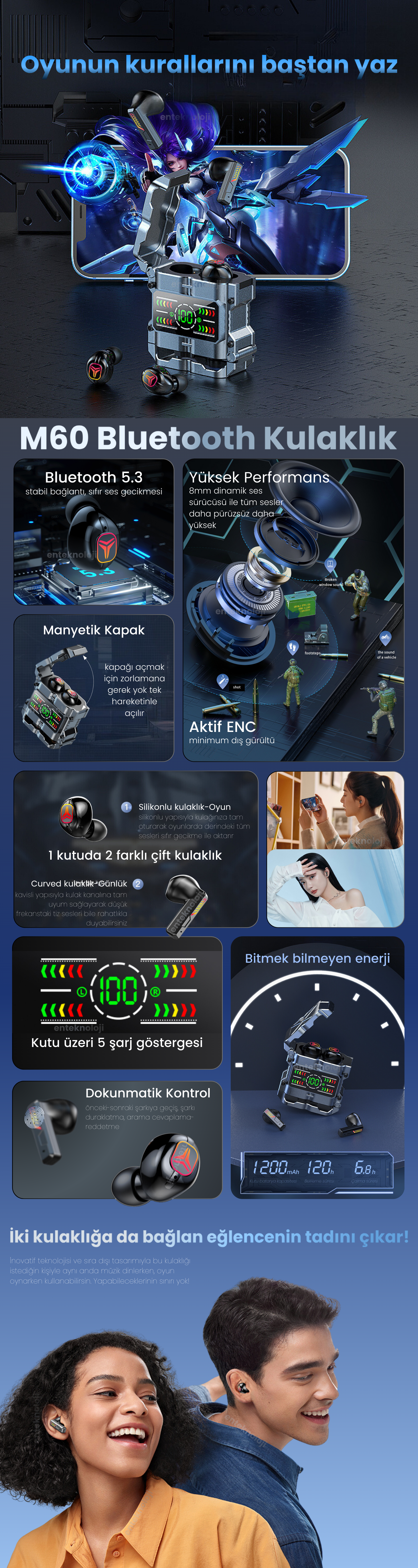İki kulaklık, iki kat performans, iki kat güç. M60 Bluetooth Kulaklık