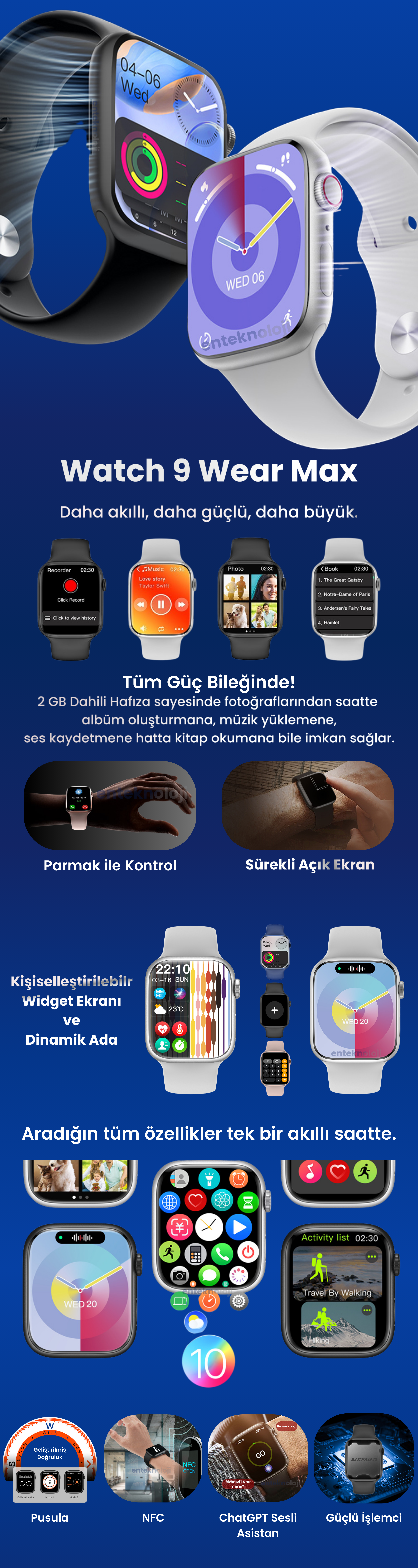 Zengin özellikleri ile kullanıcısına yeni bir dünyanın kapılarını aralayan Watch 9 Wear Max; Bileğinden hiç çıkarmak istemeyeceğin kaliteli akıllı saat deneyimini yüksek teknolojisiyle birleştirerek, kullanım zevkini zirveye çıkarıyor.